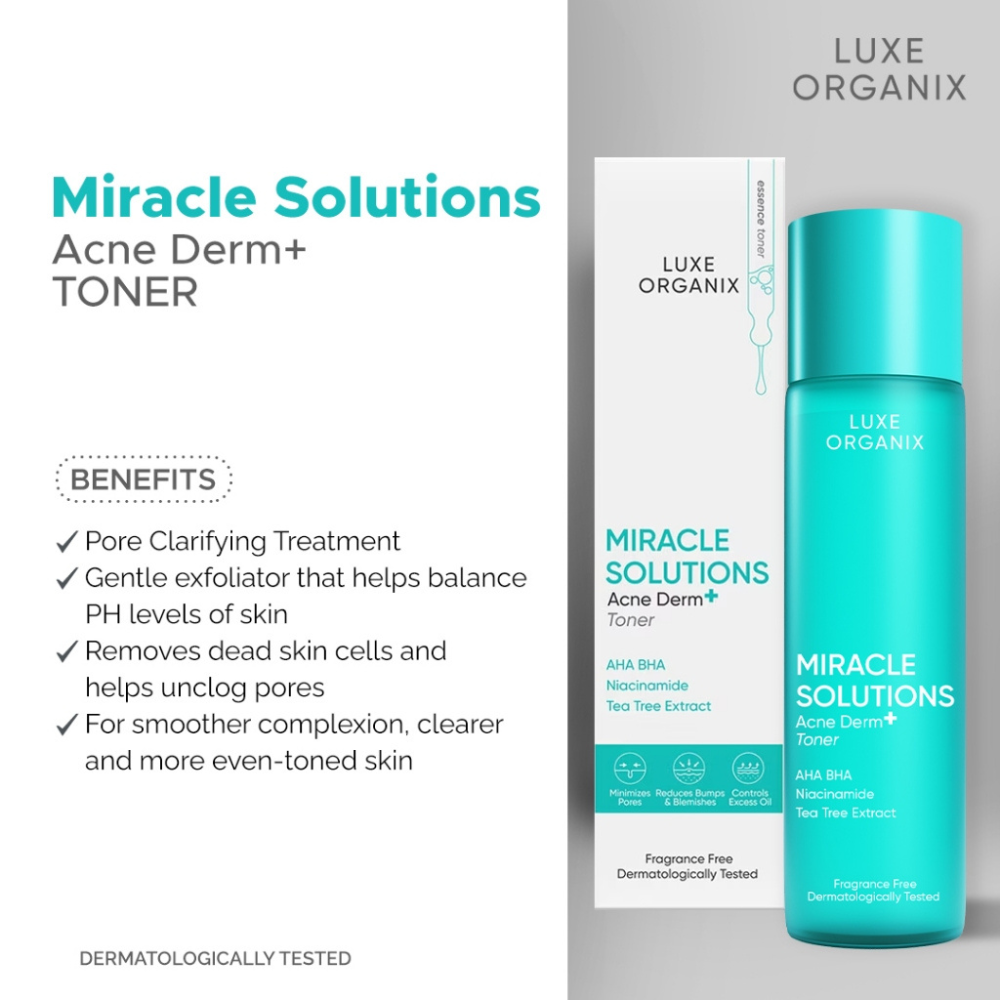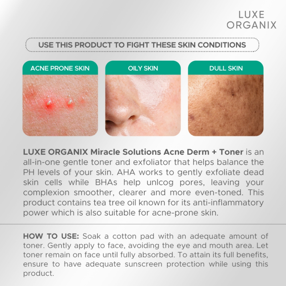 Luxe Organix Miracle Solutions Acne Derm+ Toner is an all-in-one gentle toner and exfoliator that helps balance the PH levels of your skin. AHA works to gently exfoliate dead skin cells while BHAs help unlcog pores, leaving your complexion smoother, clearer and more even-toned. This product contains tea tree oil known for its anti-inflammatory power which is also suitable for acne-prone skin.
