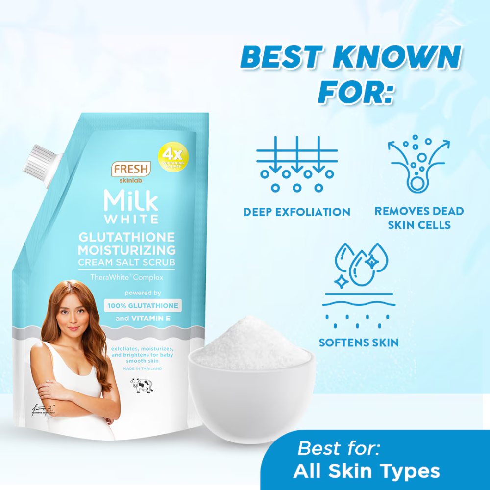 Take home an indulgent spa experience with this milk-based salt scrub. Formulated with TheraWhite Complex and infused with the double whitening power of Glutathione and milk proteins, this creamy salt scrub helps to gently exfoliate your skin, lifting away deep-seated dirt and dry skin cells to reveal a softer, smoother and fairer skin with regular use.