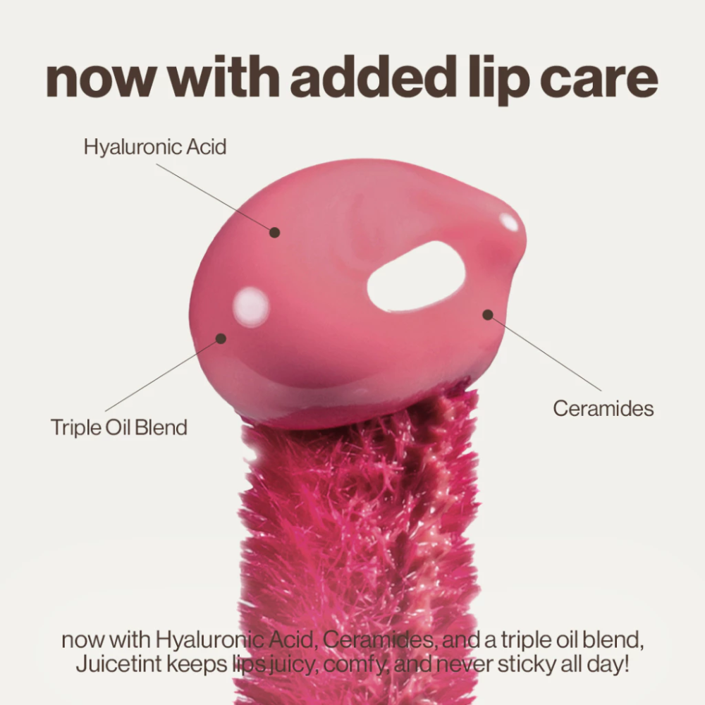 Juicetint is a soft hydrating lip oil, now boosted with nourishing lip care ingredients. Juicetint starts glossy, melts into a lightweight tint, and leaves a soft, lasting stain.