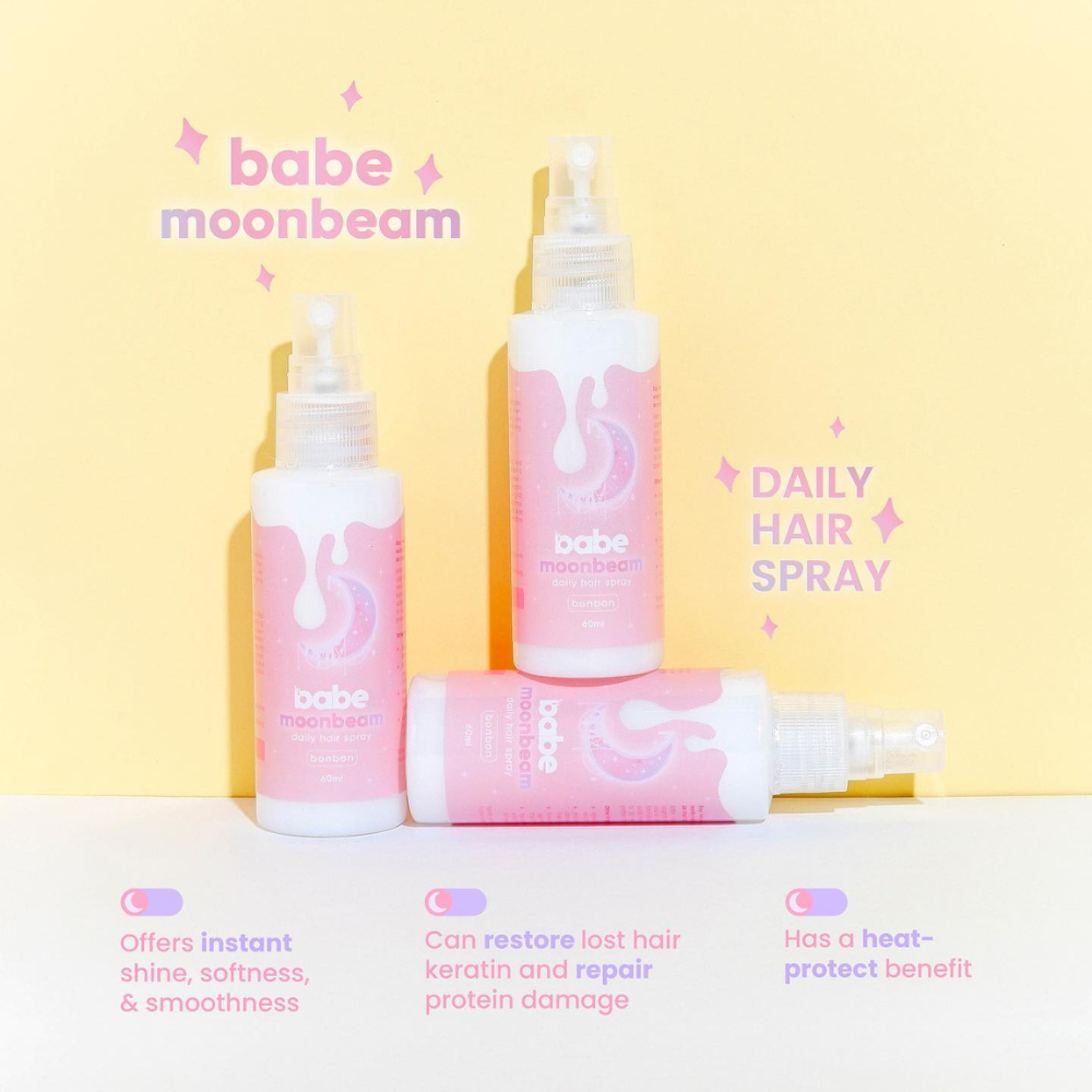 Say hello to your new daily hair spray that works twice as hard so you can have twice as much fun! Babe Moonbeam Spray is basically an upgrade of the Gleam Daily Hair Spray that you've come to love, with an improved formulation that contains protein, and amino acids that work through your hair from root to tip, restoring lost keratin and repairing protein damage from chemical treatments.