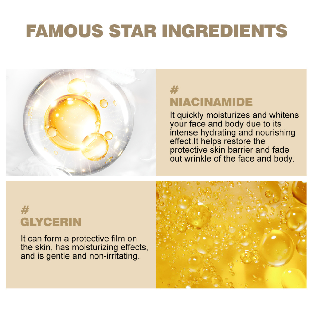 This serum has double enrichment effect with sodium hyaluronate and niacinamide that can powerfully soothe and moisturize skin. It quickly moisturizes and whitens your face and body due to its intense hydrating and nourishing effect. It also helps recover dry skin to elastic, tight and soft state. It helps restore and protective skin barrier and fade out wrinkle of the face and body.