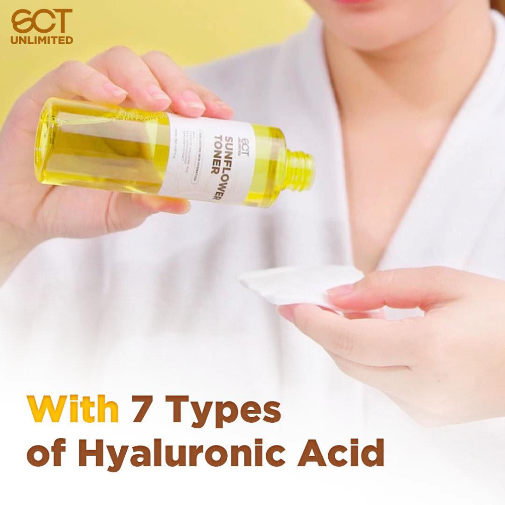 Enjoy a healthier glow with SCT Unlimited Sunflower Toner. Packed with 7 types of hyaluronic acid, it will help hydrate and retain the skin's natural moisture, penetrating its deepest layers, fighting dryness and common skin problems.