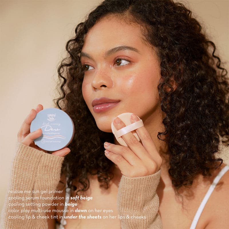 Composed of a unique 50% water + powder blend, Happy Skin's Fresh Morning Dew Aqua Cooling Setting Powder delivers a refreshing sensation that invigorates skin upon contact.